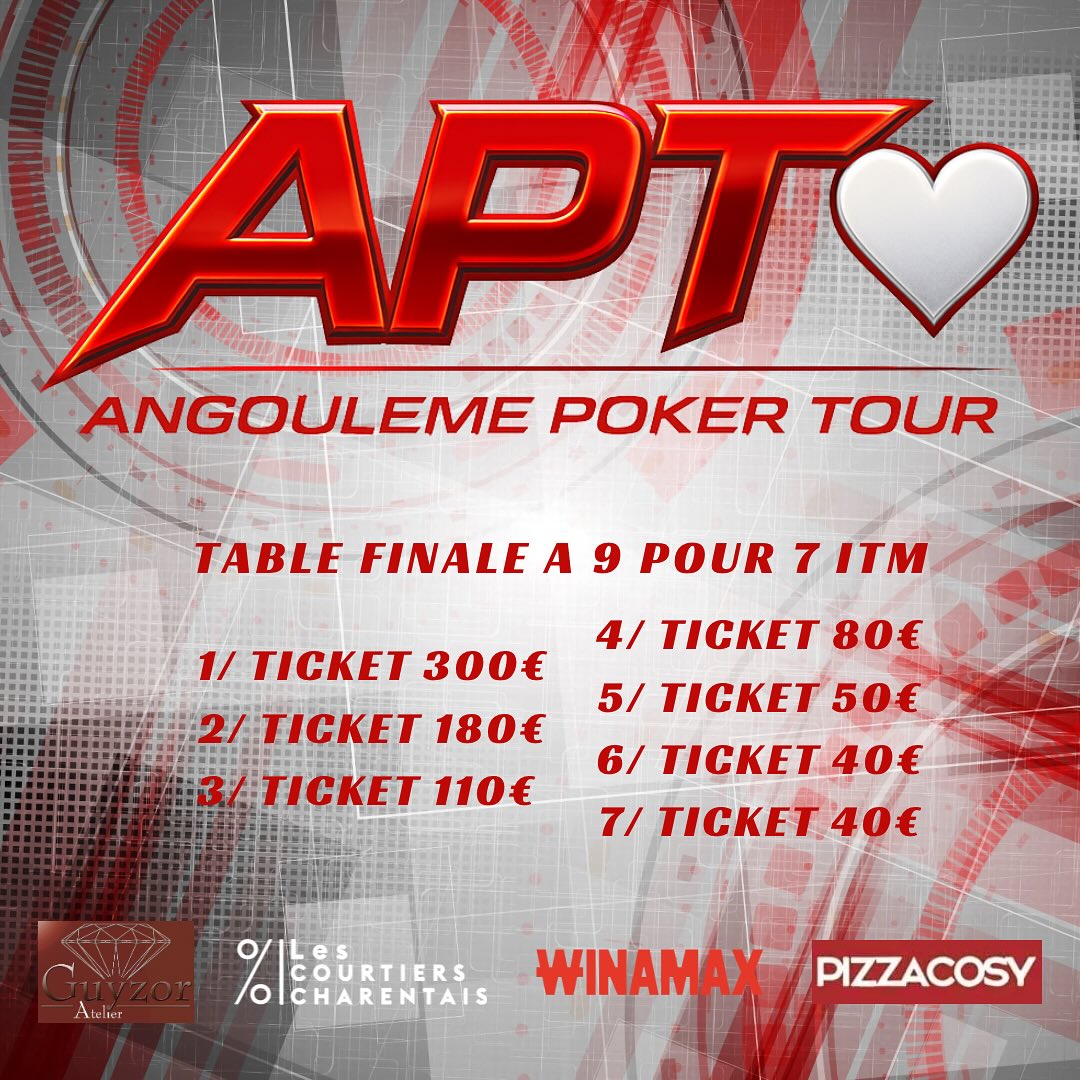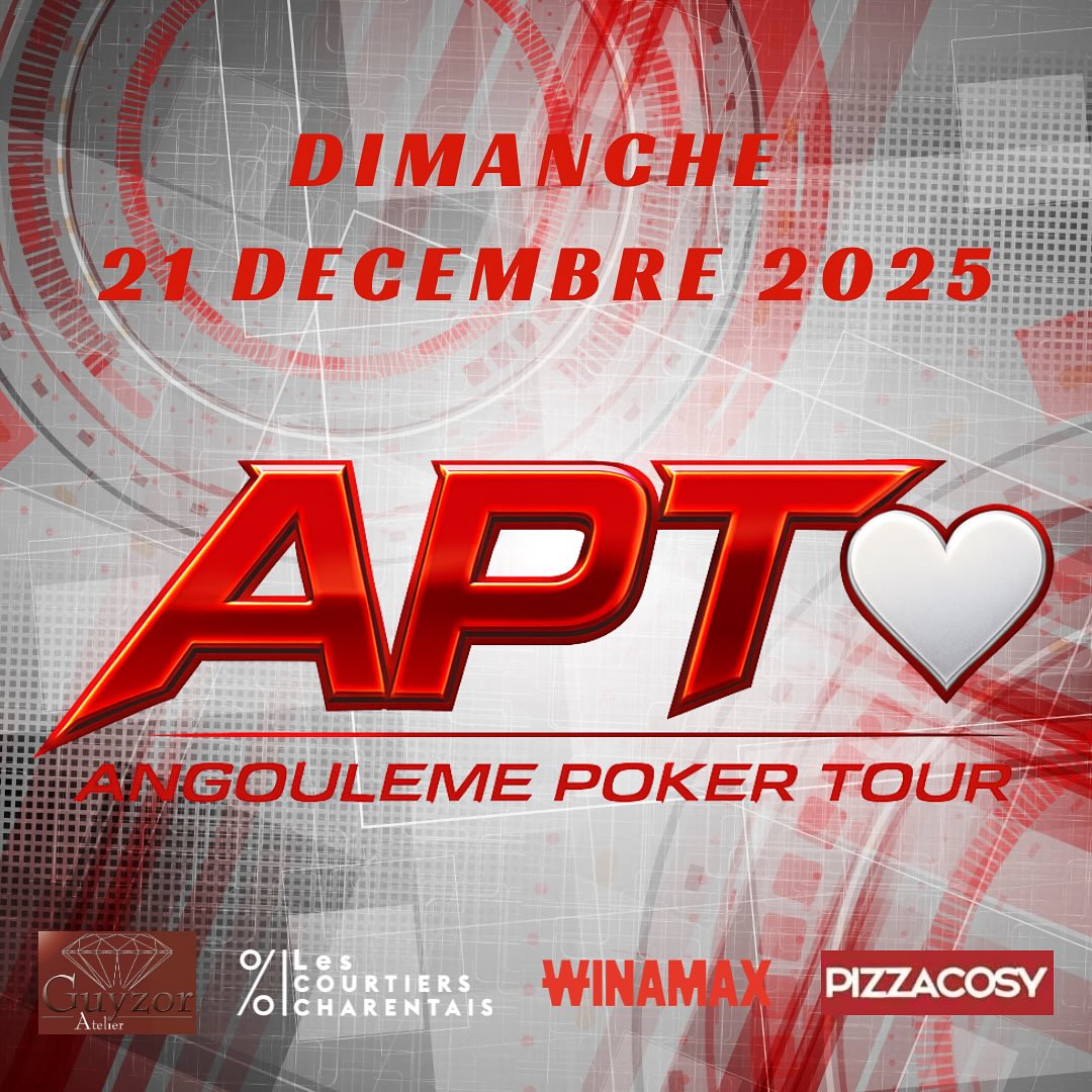publié le 08/12/2025 dans Evénements du club ![]() ![]() ![]() ANGOULE?ME POKER TOUR – ÉDITION DE CŒUR Dimanche 21 décembre 2025 Début du tournoi : 10h00 2, place de Bourgine – 16000 Angoulême Le circuit Angoulême Poker Tour continue et laisse place à l’Édition de Cœur ! Nouveau design, nouvelle saison, mais toujours la même passion pour le jeu. Qui succédera à notre triple vainqueur local SHARKYNNHHOOO ? Qui soulèvera le trophée et repartira avec le ticket live d’une valeur de 300 € ? Petit-déjeuner et repas du midi offerts par le club, dans une ambiance conviviale autour du thème « À la bonne franquette ». Inscription obligatoire en amont afin de garantir la meilleure organisation possible et le bon déroulement de la journée. |
