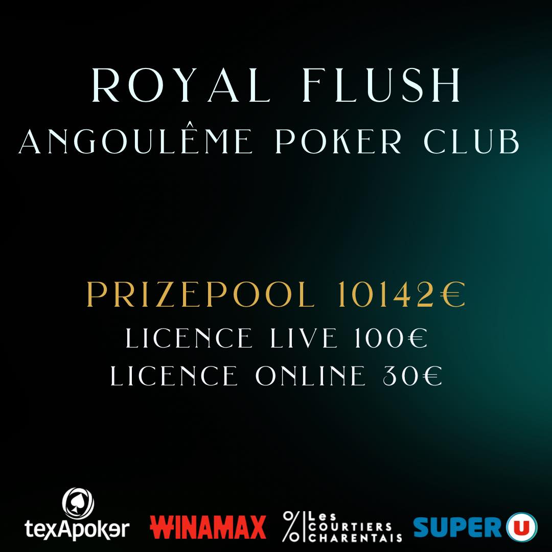 Fondé en Janvier 2008, Royal Flush Angoulême Poker Club (association Loi 1901) compte une centaine d'adhérents qui se réunissent de plus en plus nombreux chaque semaine pour partager ensemble leur passion.