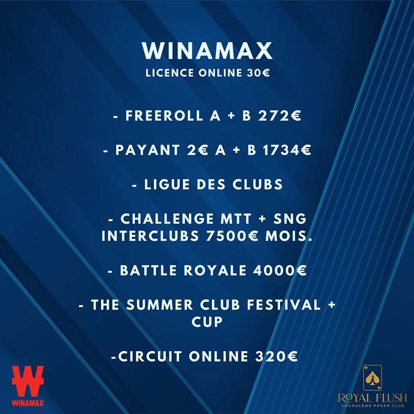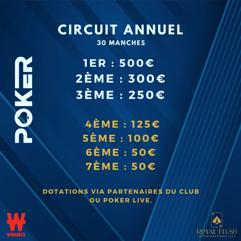 publié le 08/12/2025 dans Evénements du club ![]() ![]() ![]() ANGOULE?ME POKER TOUR – ÉDITION DE CŒUR Dimanche 21 décembre 2025 Début du tournoi : 10h00 2, place de Bourgine – 16000 Angoulême Le circuit Angoulême Poker Tour continue et laisse place à l’Édition de Cœur ! Nouveau design, nouvelle saison, mais toujours la même passion pour le jeu. Qui succédera à notre triple vainqueur local SHARKYNNHHOOO ? Qui soulèvera le trophée et repartira avec le ticket live d’une valeur de 300 € ? Petit-déjeuner et repas du midi offerts par le club, dans une ambiance conviviale autour du thème « À la bonne franquette ». Inscription obligatoire en amont afin de garantir la meilleure organisation possible et le bon déroulement de la journée. |