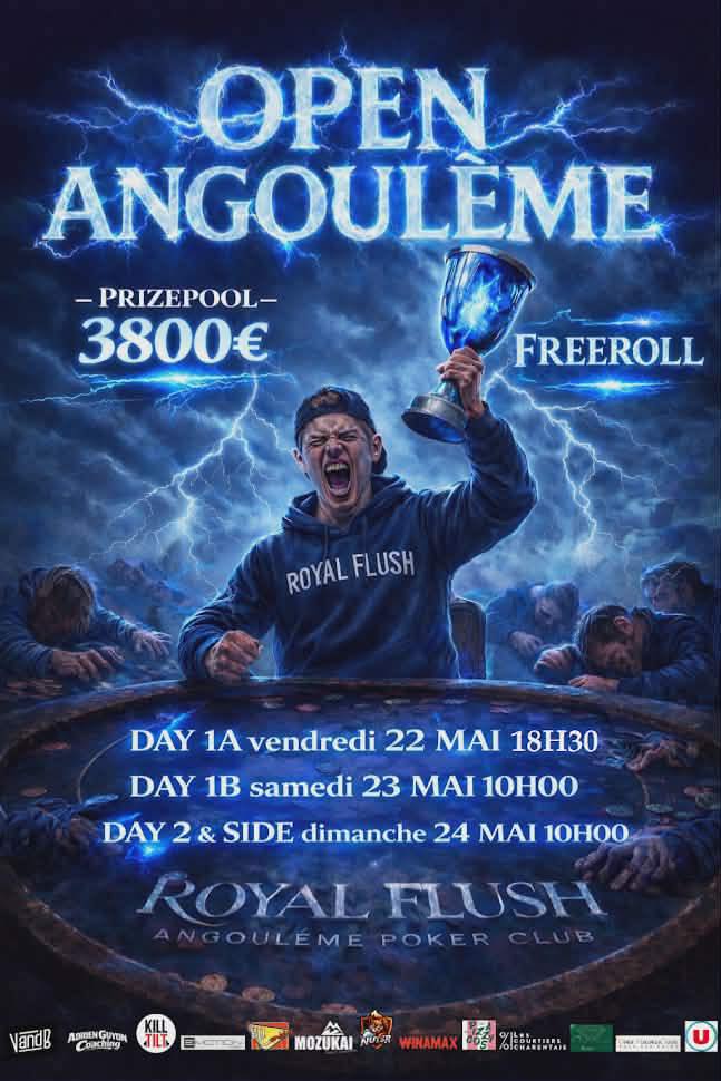 publié le 08/12/2025 dans Evénements du club ![]() ![]() ![]() ANGOULEME POKER TOUR – ÉDITION DE CŒUR Dimanche 21 décembre 2025 Début du tournoi : 10h00 2, place de Bourgine – 16000 Angoulême Le circuit Angoulême Poker Tour continue et laisse place à l’Édition de Cœur ! Nouveau design, nouvelle saison, mais toujours la même passion pour le jeu. Qui succédera à notre triple vainqueur local SHARKYNNHHOOO ? Qui soulèvera le trophée et repartira avec le ticket live d’une valeur de 300 € ? Petit-déjeuner et repas du midi offerts par le club, dans une ambiance conviviale autour du thème « À la bonne franquette ». Inscription obligatoire en amont afin de garantir la meilleure organisation possible et le bon déroulement de la journée. |